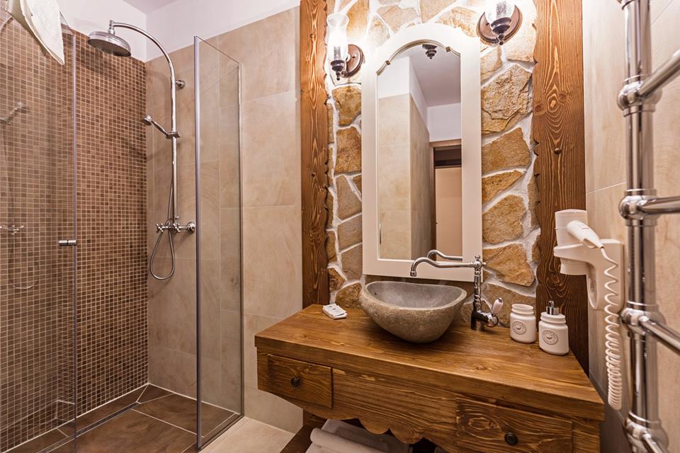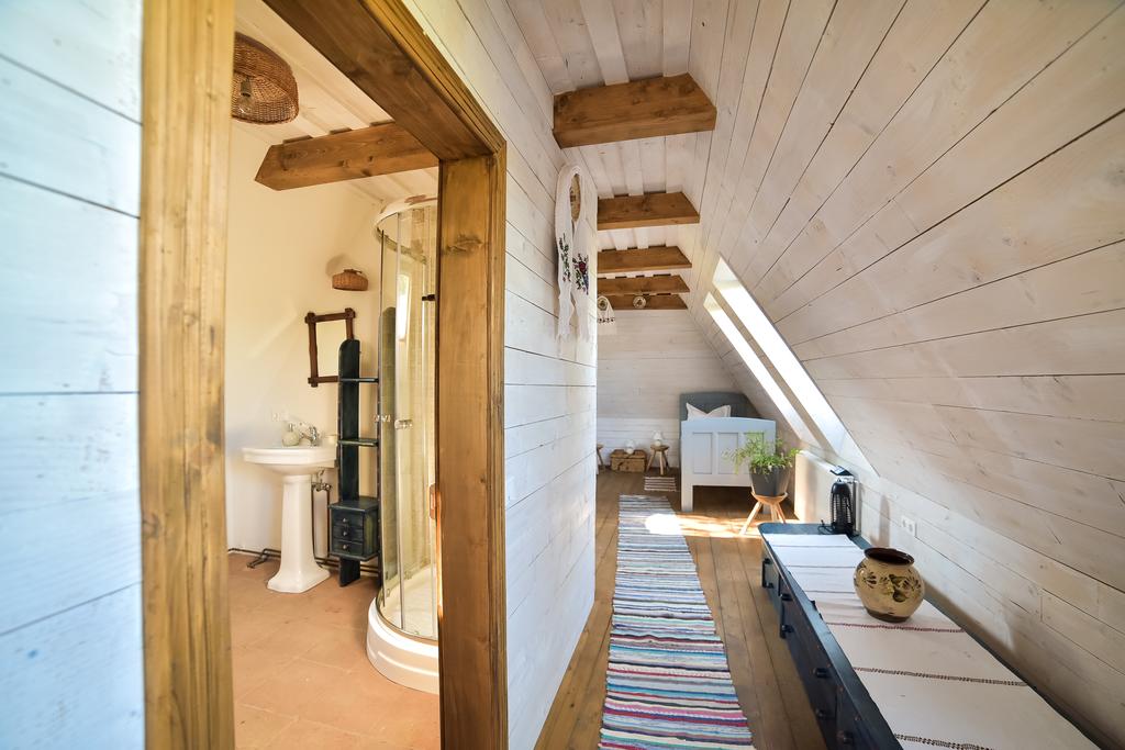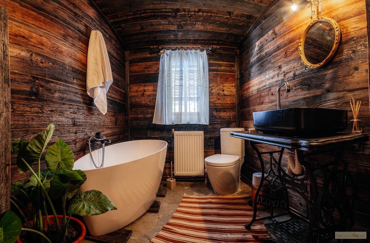 - băi proprii, cu elemente din lemn și cărămidă;