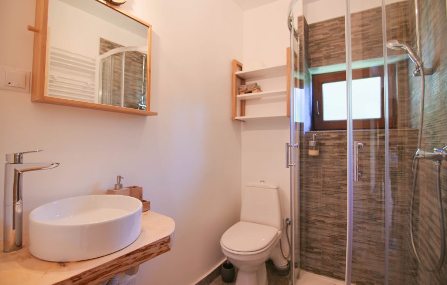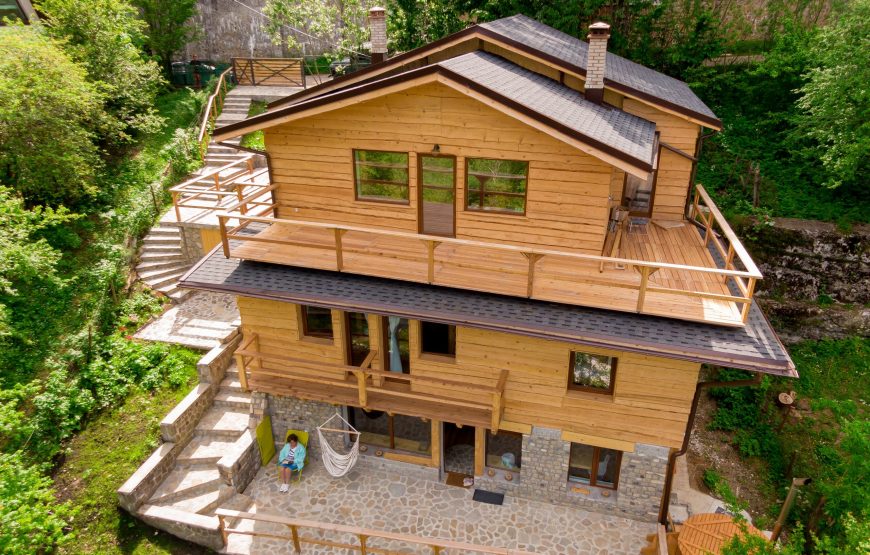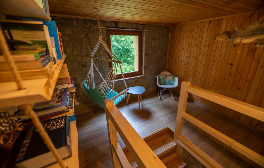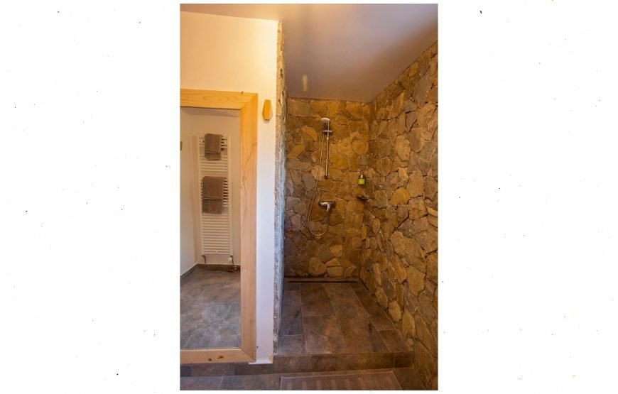 Cabana este construită din lemn și piatră locală. Terasa generoasă din piatră vă va conecta cu maretia stancilor, iar lemnul cu veșnicia pădurii. Bucurați-vă de terasa spațioasă, de hamacele de afară și din interior, de bunătăți la grătar și de ciubarul din lemn.