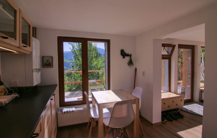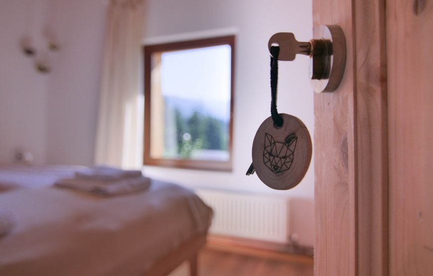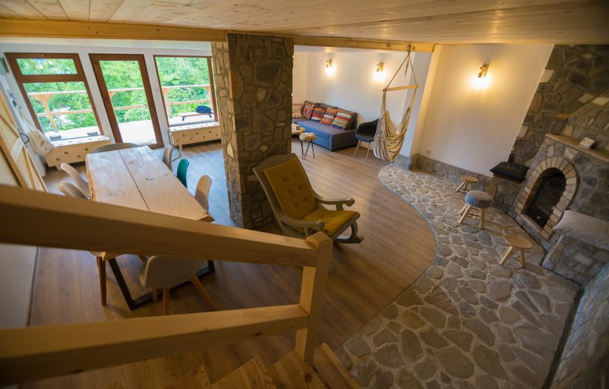 Interiorul imbina rusticul cu modernul, iar rezultatul este unul excelent, atat din punct de vedere estetic, cat si din cel al confortului. În serile reci, întâlnirile se dau la șemineu, în timp ce priviti cum soarele se ascunde dupa crestele montane. Relaxare totală.