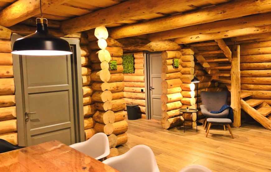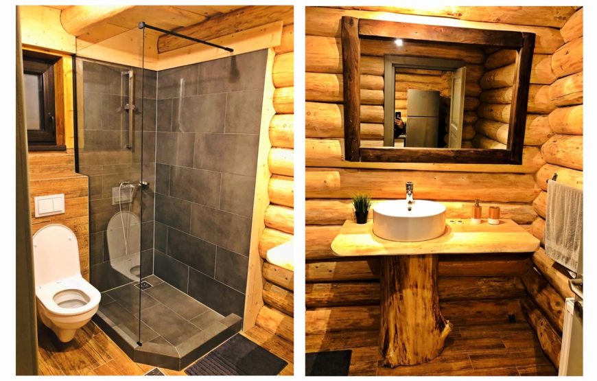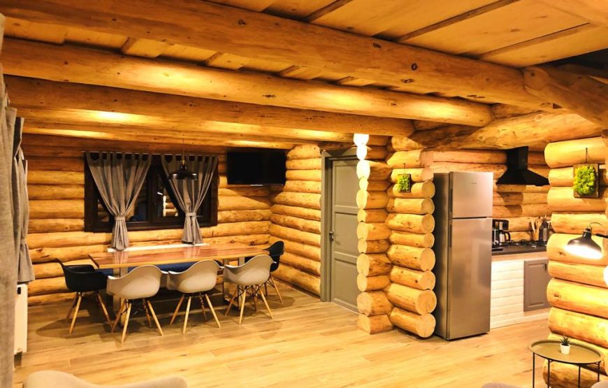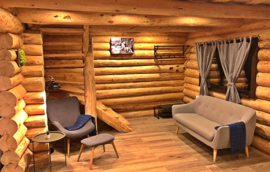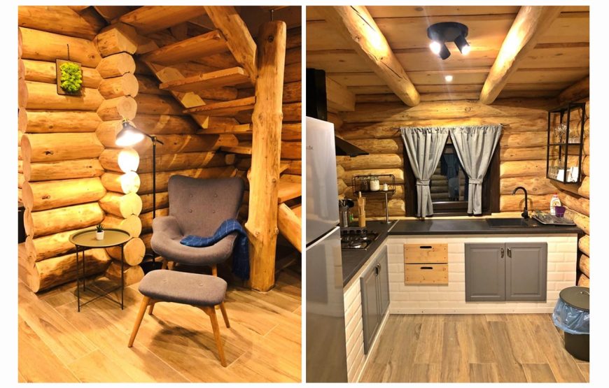 Cabana farmecă încă de la intrarea în grădină. O construcție din butuci de lemn, cu geamuri în care se reflectă pădurea, vă cheamă înăuntru.