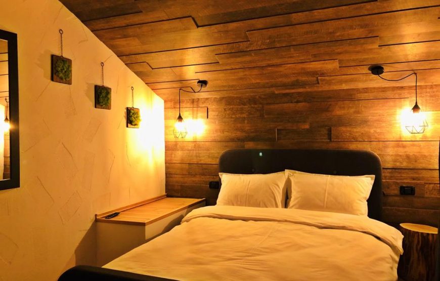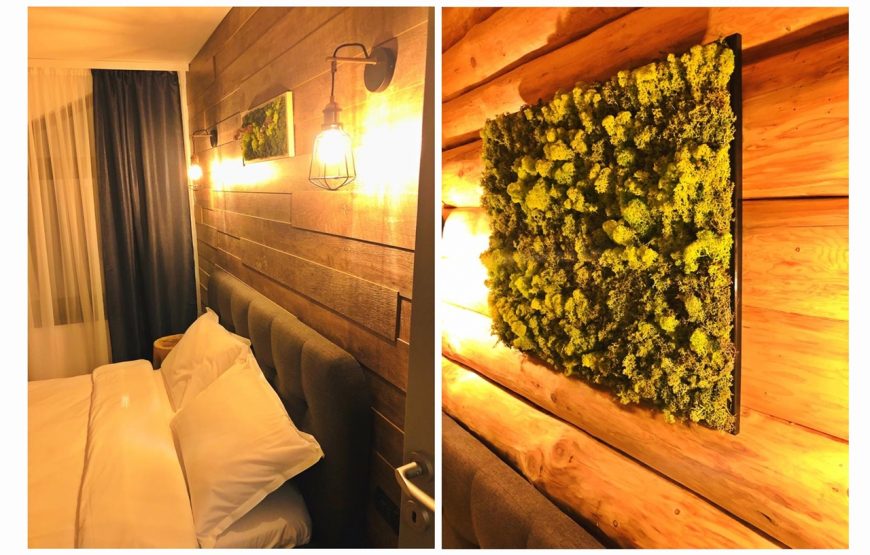 Interiorul dezvăluie calm, observându-se cum totul a fost realizat cu suflet în cel mai mic detaliu: tablouri cu mușchi de copac în loc de poze, butuci de copac pe post de noptiere, paturi moi, băi moderne și bucătărie utilată complet. Cabana dispune de patru dormitoare, cu o capacitate pentru 9 adulți și 5 copii.