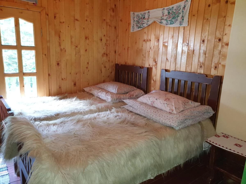Mobilierul rustic te poartă cu gândul la vremurile de demult, iar arhitectura cabanei se integrează perfect în decorul pictat de pădure.