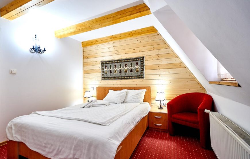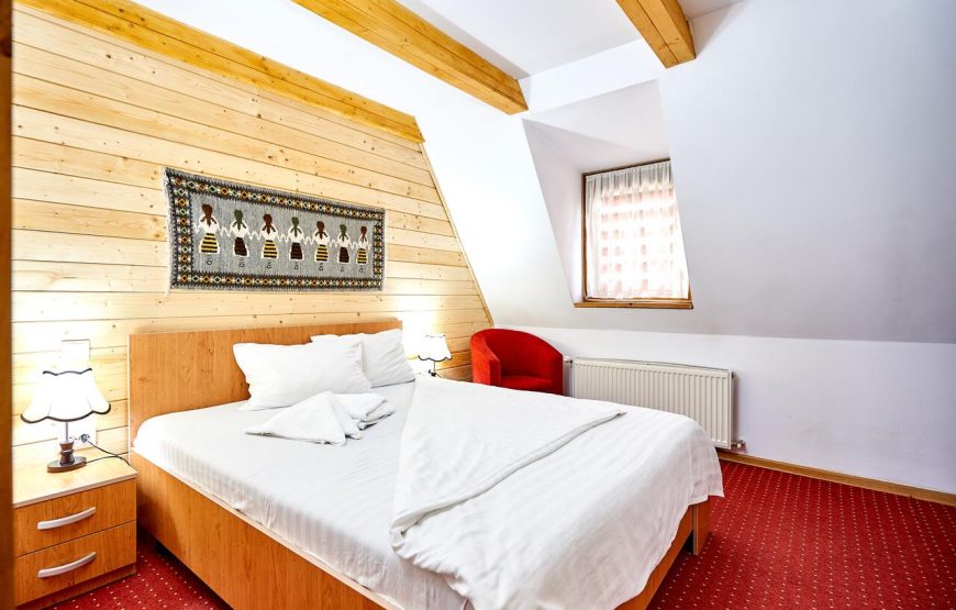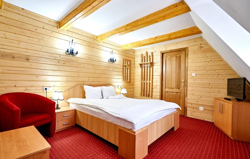 Într-o mare de natură, cu priviri panoramice îndreptate spre culmi împădurite, se ivește cazarea pitorească, realizată cu tehnica sculpturii în lemn.