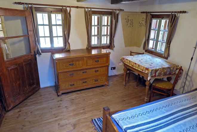 Aceasta casa traditionala poate gazdui doua (pana la trei) persoane intr-un spatiu extrem de generos. Casa Nicu este compusa dintr-o bucatarie locuibila de 18 mp, complet mobilata si utilata, o baie cu dus si WC si o camera de 18 mp accesibila din bucatarie, ce dispune de pat dublu si tv LED. Cele trei ferestre mari din dormitor ofera o panorama superba catre biserica satului.