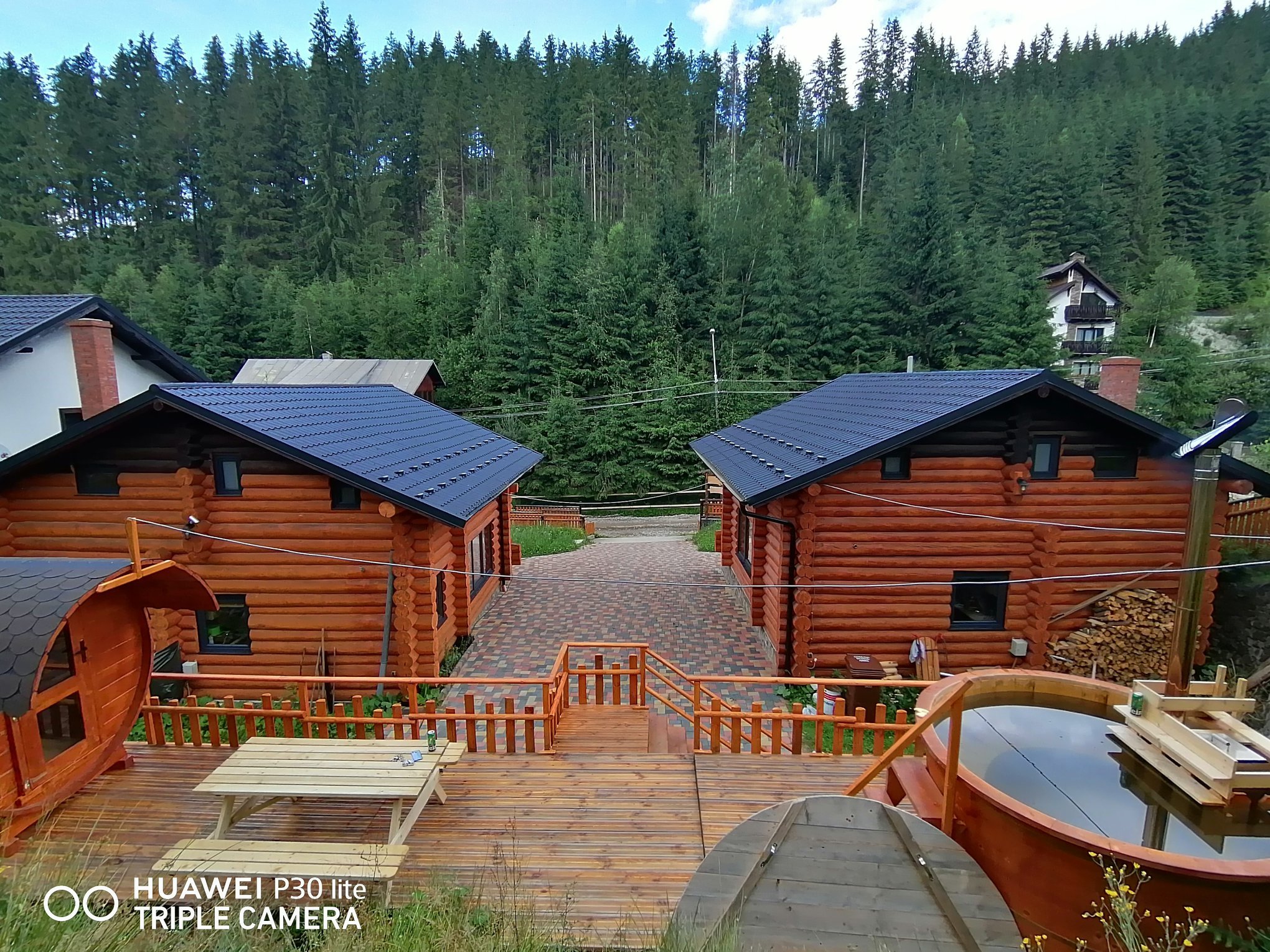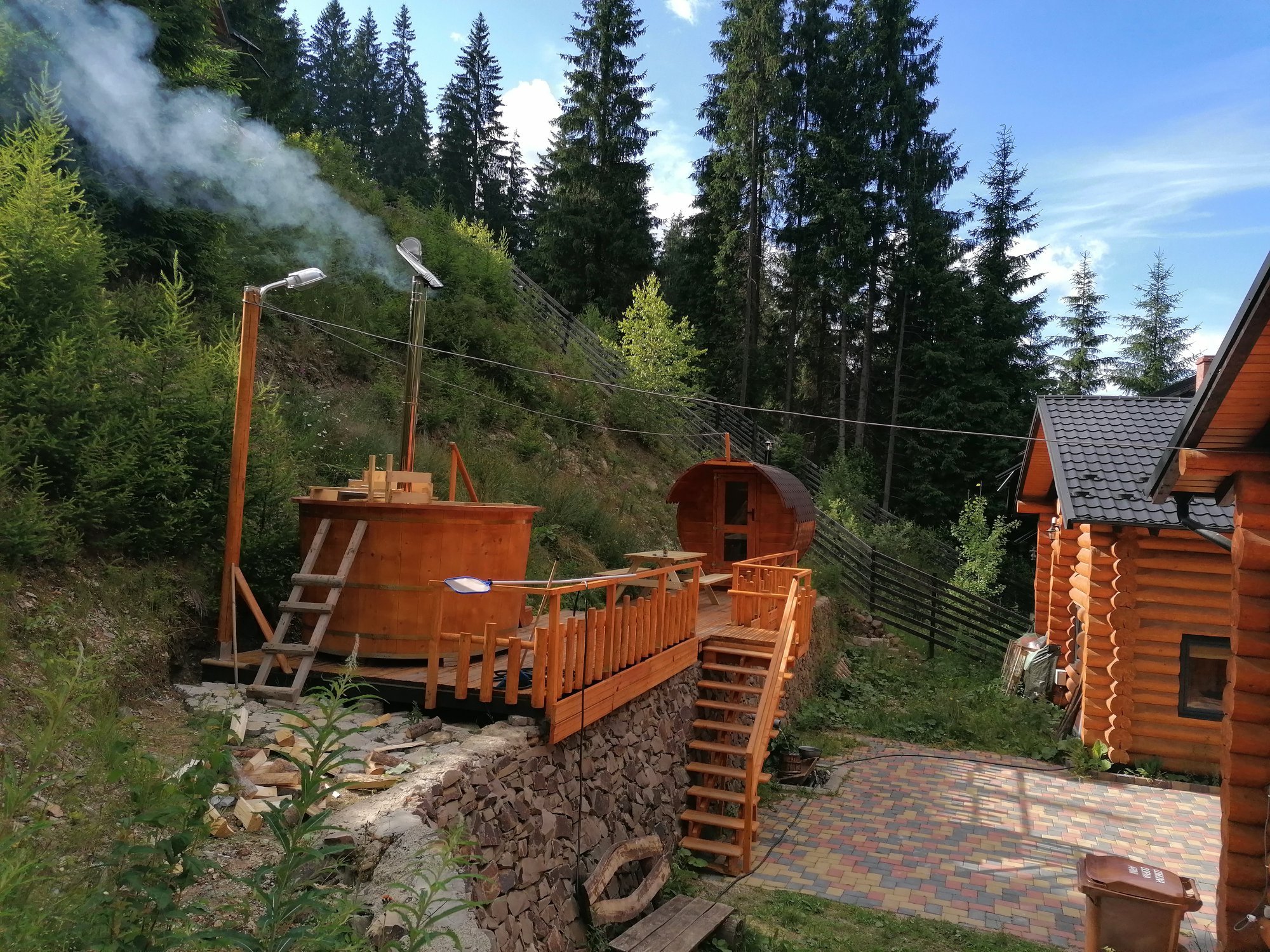 Case Eco Dorna, ciubăr și saună într-o pădure de conifere
