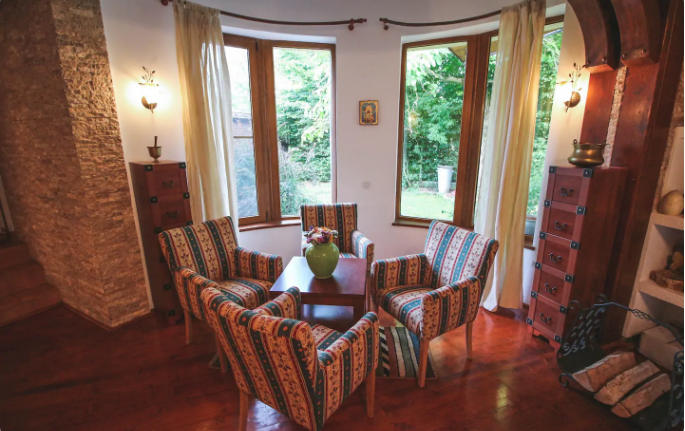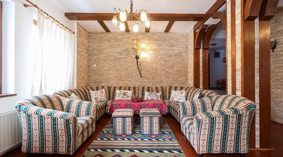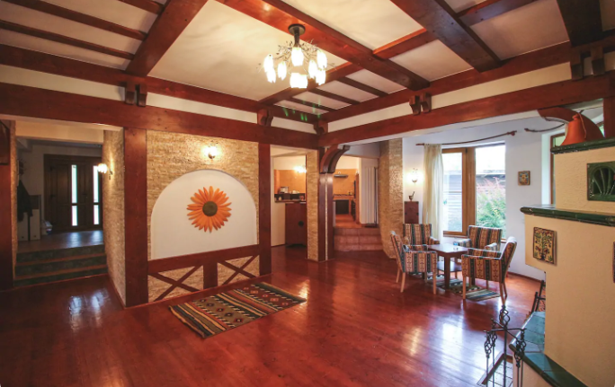 Un conac superb, într-un cadru de basm, la poalele Munților Cindrel. Mobilierul din lemn, pictat manual, obiectele artizanale din ceramică, șemineul somptuos și alte detalii arhitecturale conturează imaginea idilică a unuia dintre cele mai frumoase locuri de cazare din Mărginimea Sibiului.