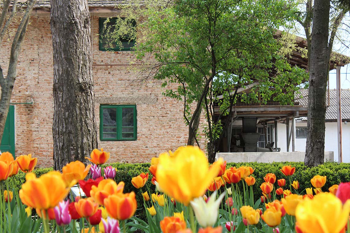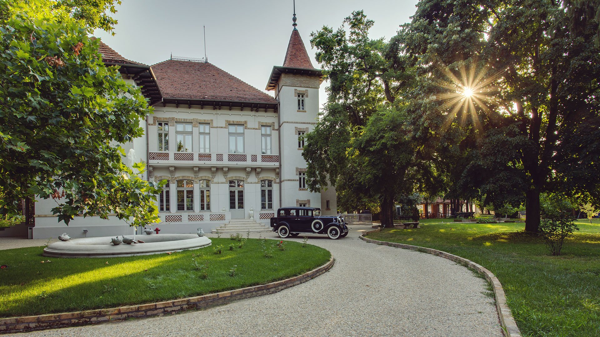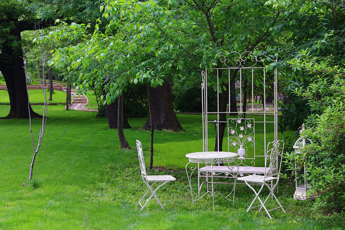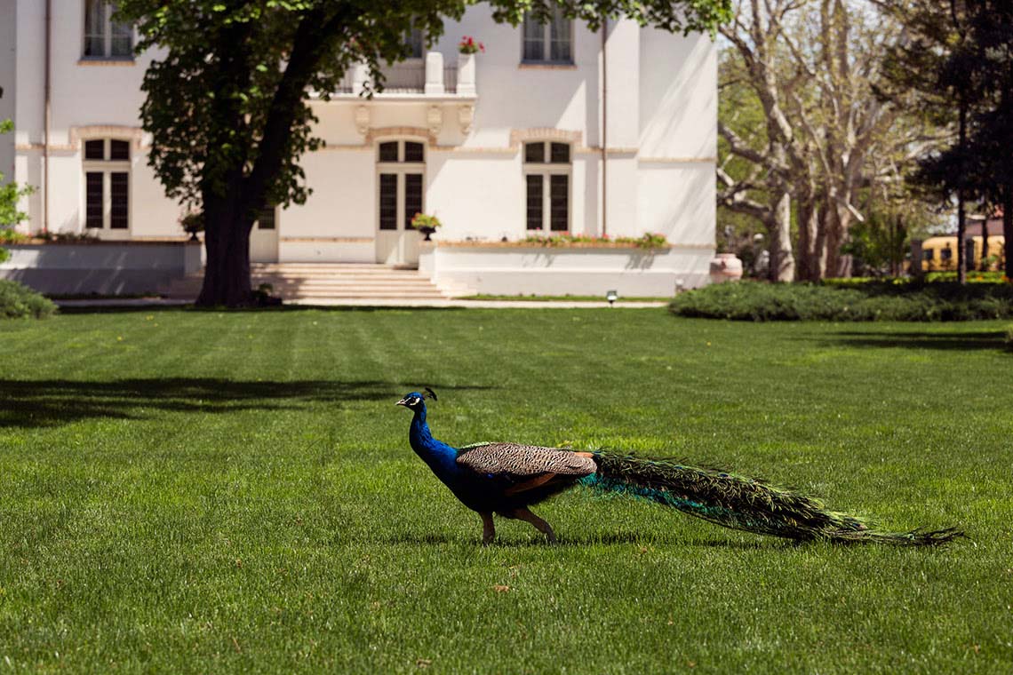 Aleile șerpuite, îmbrăcate în piatră, vă poartă prin grădini luxuriante. Păunul de un albastru imperial, mirosul de liliac, micul lan de lalele, foișorul, fântâna și mașina de epocă sunt doar câteva dintre comorile conacului.