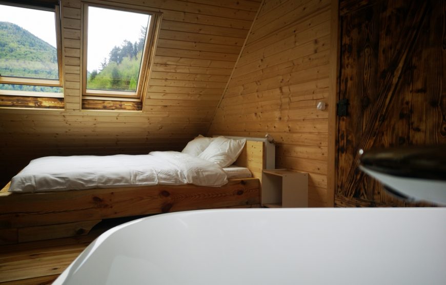 Din podul copilăriei au fost aduse paturi din lemn confortabile, căzi de baie cu inspirație vintage, terasă din lemn pe care orice masă are prilejul de a fi servită în adierea muntelui și a peisajelor magice.