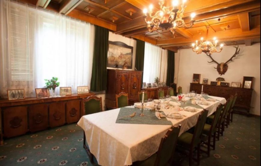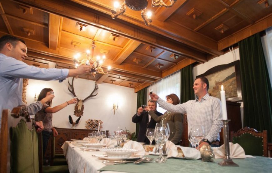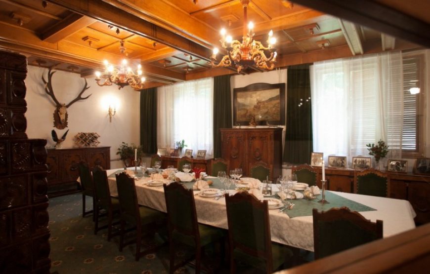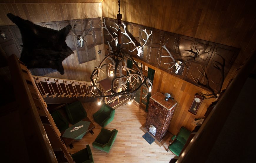 E ora cinei, bucătarul a pregătit delicii din carne de vânat și păstrăv proaspăt pescuit din pârâul situat în fața cabanei. În living-ul care vă duce în timp, cu o masă lungă, candelabru cu lumină difuză, trofee de animale și fotografii, totul capătă o atmosferă aparte, amintind de cinele cu fast ale liderului.