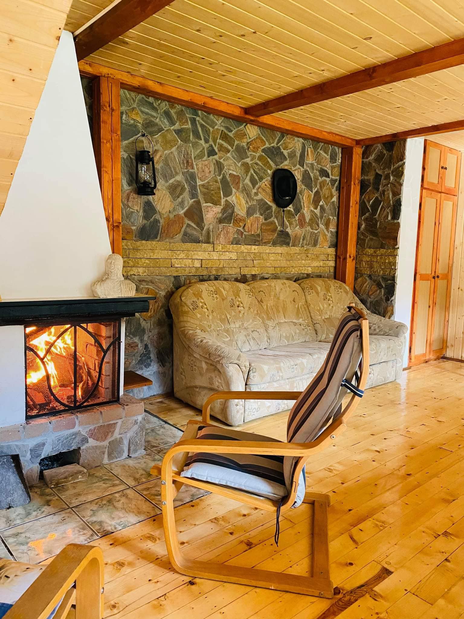 De asemenea, la parter se află un living spațios cu o canapea extensibilă, o zonă de luat masa și o chicinetă. Un șemineu care să te încălzească în zilele reci de iarnă te așteaptă să petreci câteva clipe alături, în timp ce te bucuri de o ceașcă de ceai sau cafea și o carte bună.