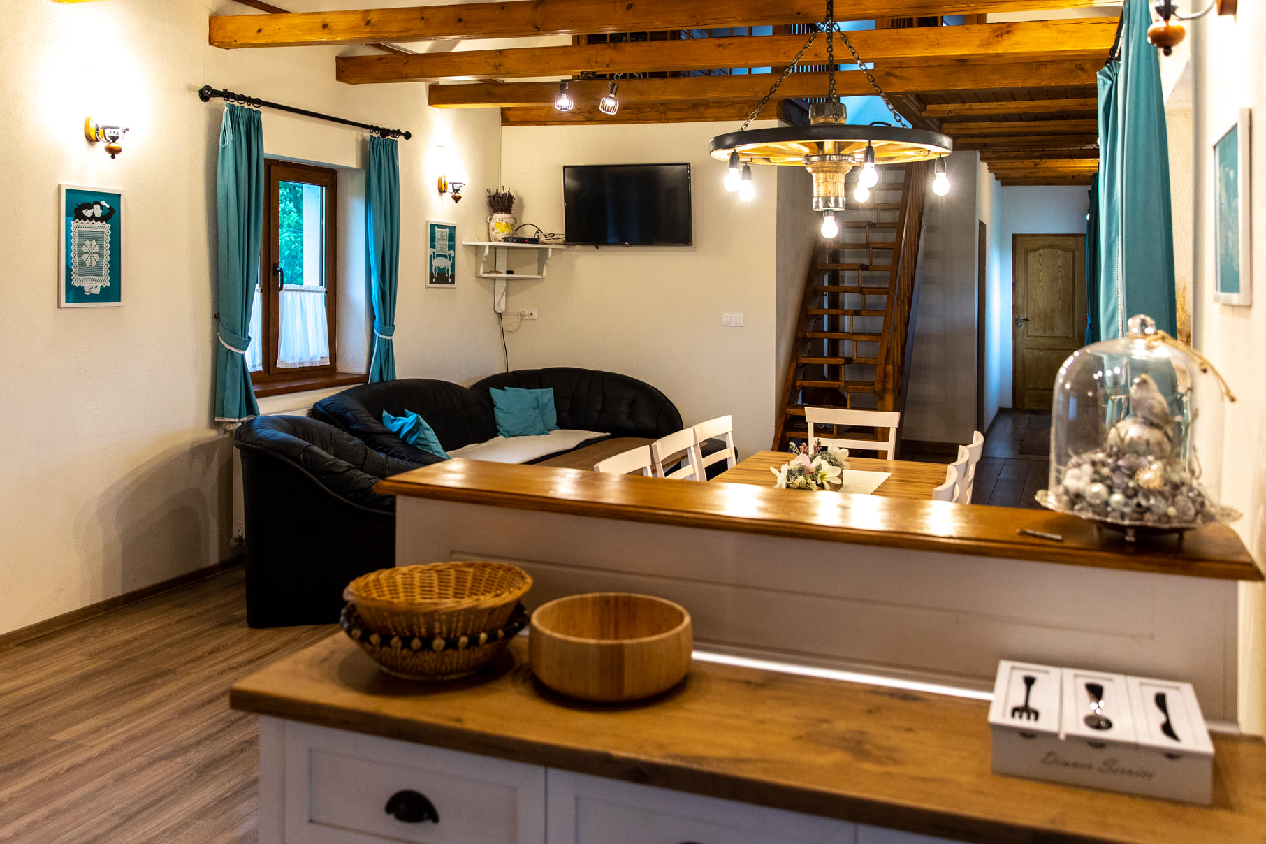 Amenajată pe 2 nivele, parterul casei dispune de un living, o zonă de luat masa și o bucătărie complet mobilată și utilată. Capacitatile camerelor diferă, una dintre ele fiind cu un pat dublu matrimonial, iar celelalte fiind fie cu 2 paturi, fie cu 5 paturi de o persoană. De asemenea, cazarea dispune și de 2 băi comune cu cabină de duș.
