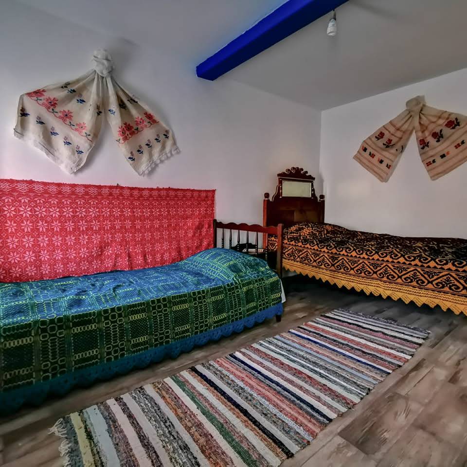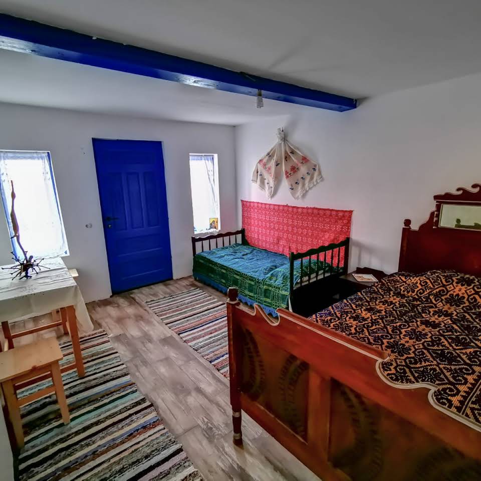Casa bătrânească s-a transformat în mâinile meșterilor locali. Imaginea casei arăta cam așa: pereți crăpați, acoperiș degradat. A fost construită o sobă, a fost reparat acoperișul din stuf și nu s-a demolat nimic. S-a păstrat lemnăria și mobilierul original. Ștergarele autentice ale casei au rămas înțepenite pe pereți, la fel și cuverturile de pe pat, țesute manual.