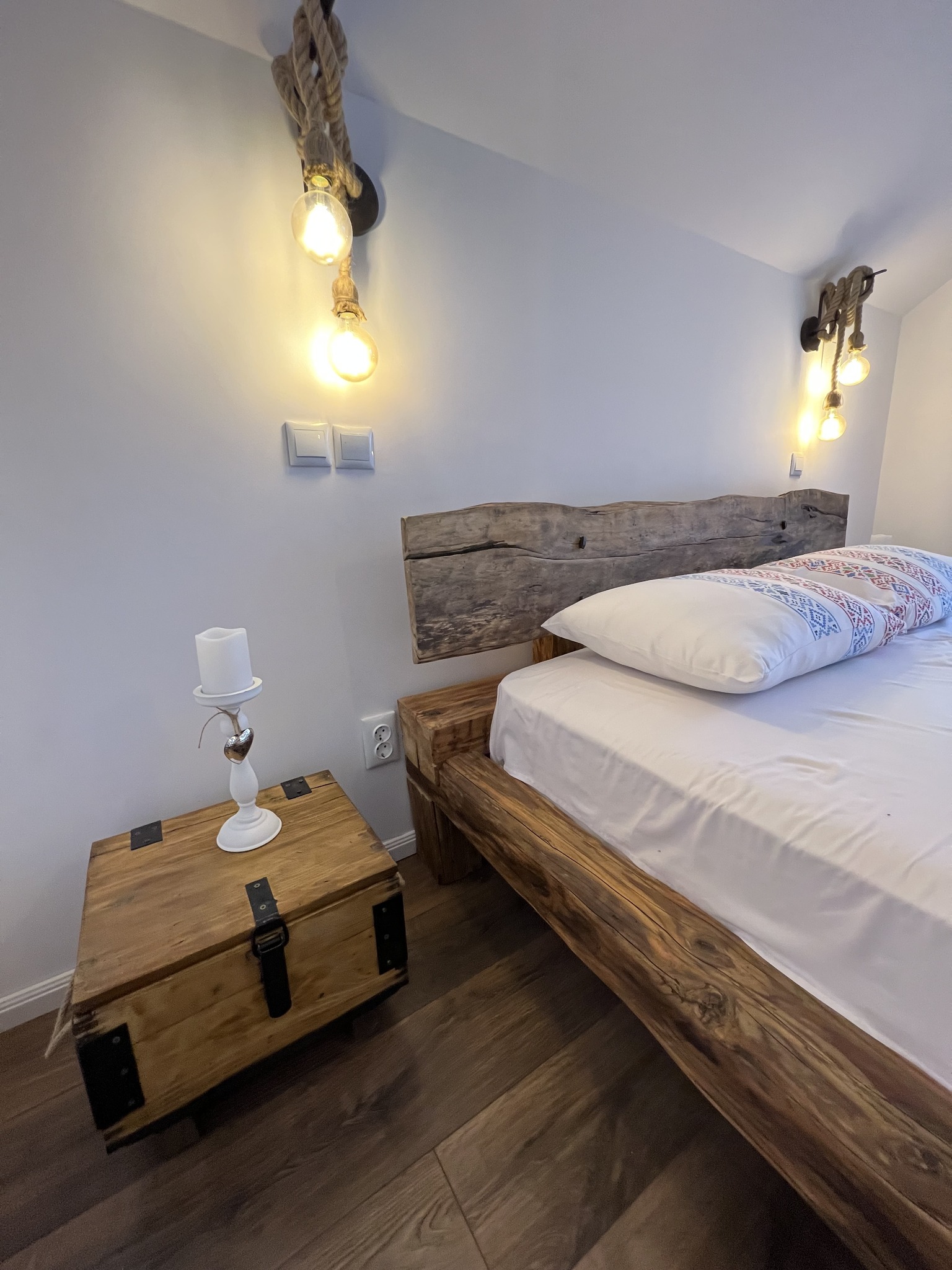 Cealaltă cameră abordează stilul rustic contemporan, fiind axată pe intimitate și confort.