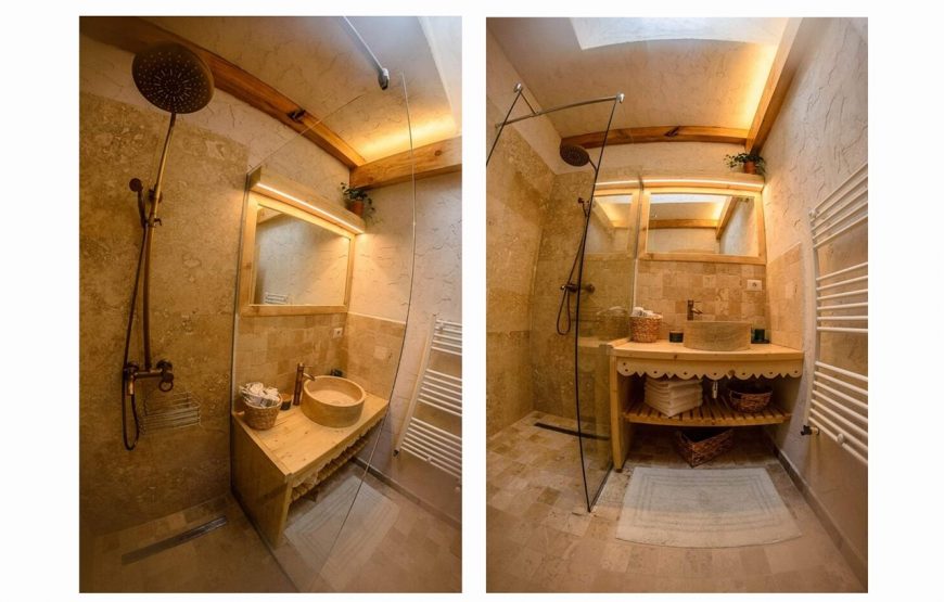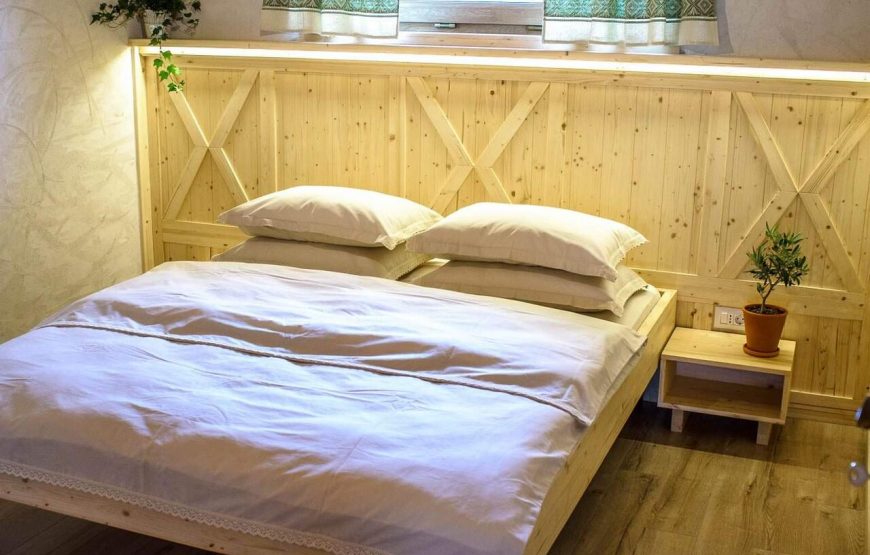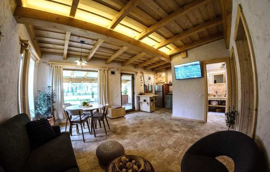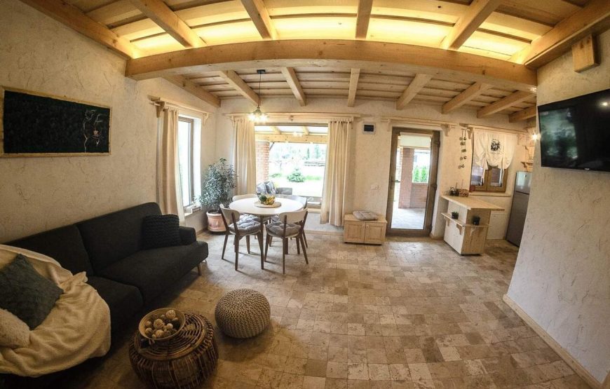 Aceasta este alcătuită din două căsuțe. În fiecare căsuță se regăsesc două dormitoare, o baie și o bucătărie utilată. Elementele din lemn se îmbină cu cele moderne, iar șederea este una confortabilă. Așternuturile și perdelele ușor brodate amintesc de bunicile care croșetau și coseau de mână. Nostalgia se resimțe, iar amintirile sunt povestite afară, pe terasa unde pregătiți bucate la grătar.