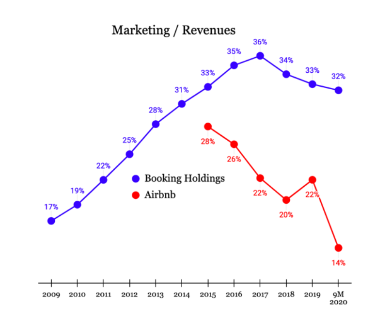 Asadar, daca gazda plateste in medie 15-20% comision pe rezervare (infrastructura tehnica + marketing), Booking.com si Airbnb investesc intre 14-36% din incasari doar in marketing. Asta in conditiile in care ambele se bucura deja de o popularitate extraordinara.