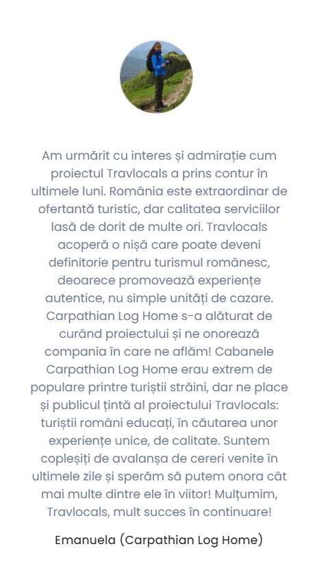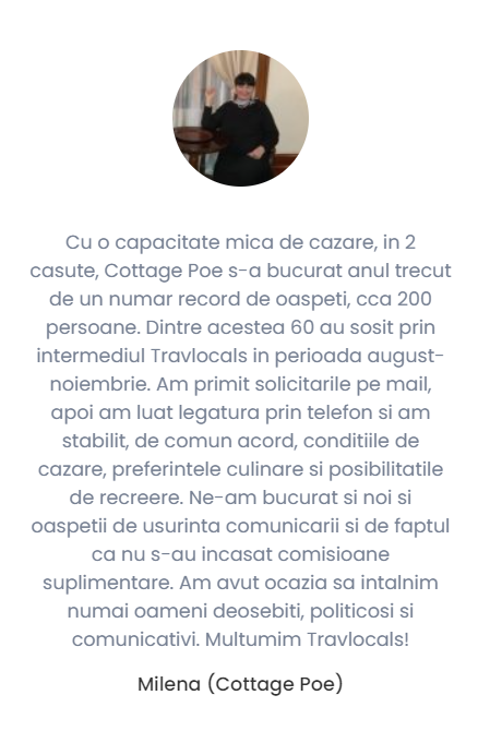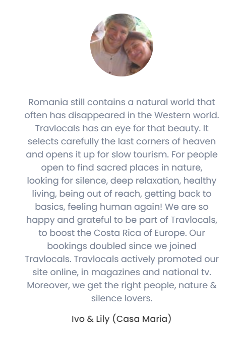 In cadrul platformei Travlocals.com, la sectiunea „Become a host”, am publicat parerile a zeci de parteneri dupa mai bine de un an de cand s-au alaturat proiectului nostru. Mai jos, vom expune doar cateva pasaje, recenziile integrale putand fi verificate la link-ul de mai sus.