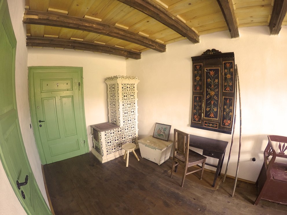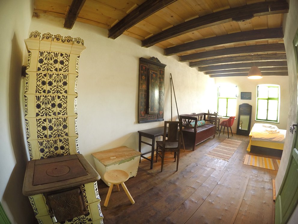 Ei bine, la Viscri 32 veti gasi o veche casa saseasca (the blue house), compusa din doua incaperi cu baie proprie si o veranda transformata intr-o bucatarie deschisa cu spatiu de lucru (laptop friendly, cu imprimanta si scanner sau acces wi-fi).