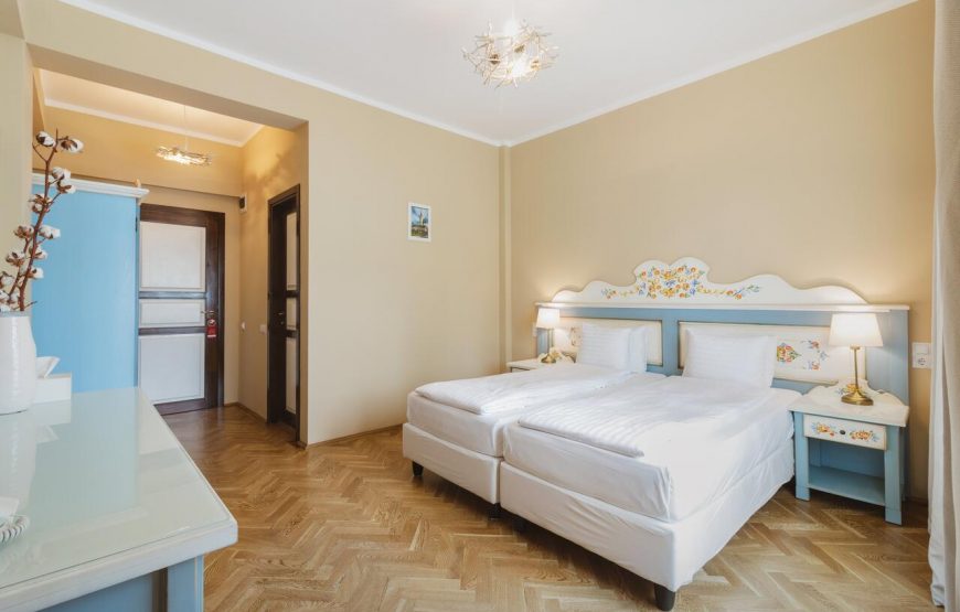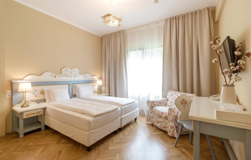 Pe cărări pietruite, în armonie cu natura, ajungeți la locul cazării voastre. Vă întâmpină o cameră pentru cuplu, cu mobilier tradițional, pictat finuț, ce seamănă cu o cameră într-o căsuță de povești. Închipuiți-vă diminețile, când deschideți fereastra și peisajul de munte este pe feed-ul vostru real, iar aerul este înlocuitorul cafelei – savurați-l din plin. Apoi, coborâți să luați micul dejun.