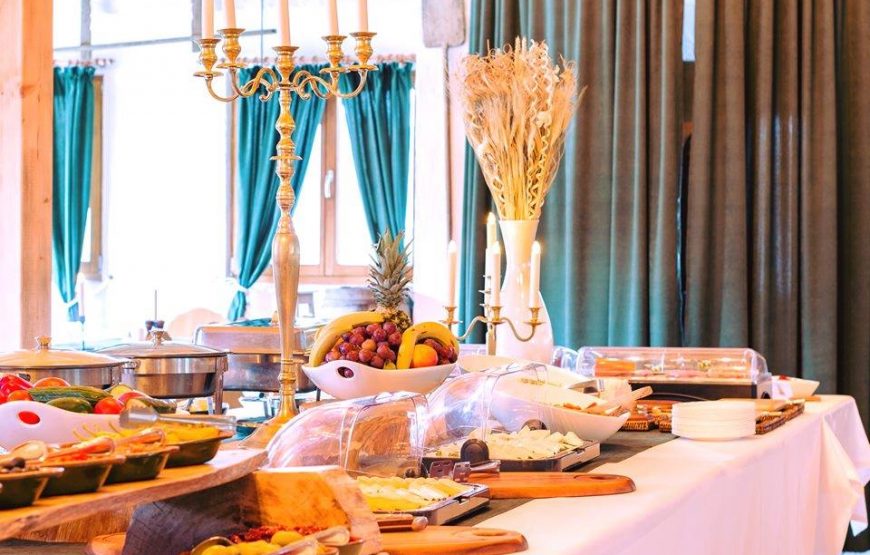 Micul dejun cuprinde produse naturale: pâine de casă pe vatră, gemuri de casă, prăjituri pregătite după rețete din generație în generație, cereale, suc de portocale și gref.